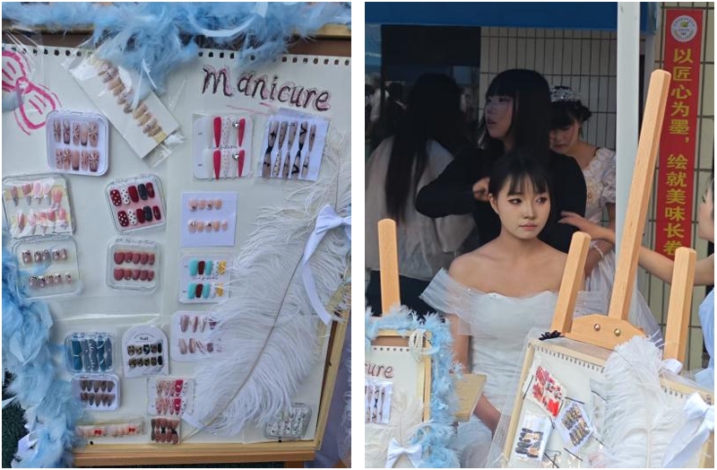 旅游服务学部则通过“指尖美学”惊艳全场:创意美甲展区陈列着主题各异的甲片设计,艺术妆与新娘妆作品诠释了学生对美学的独特理解。人物形象设计走秀环节中,美容美发专业学生自信的展示了妆容与造型设计,令参观交流的学生们直呼“大开眼界”。